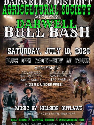 Get ready for an action-packed night at the Darwell Bull Bash! Watch top riders take on elite bulls, cheer on mutton bustin’ competitors, and enjoy family-friendly intermission fun. Stick around for live music by Hillside Outlaws, beer gardens open until midnight, food trucks, a 50/50 draw, chicken poop bingo, and high-energy entertainment all evening long. A signature Darwell summer event you won’t want to miss!